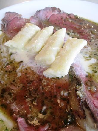 ローストビーフもやわらかくて…ソースもおいしくて… あ。向こう側が見えるくらい薄かったけどー(爆、イギリス人、怒りだすよね、このローストビーフの薄さ)。 ってか、ローストビーフってフレンチなの? も一つ残念だったのが、添えものがニョッキだったことー ニョッキ…嫌いなんだよぉ。