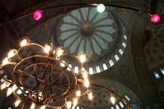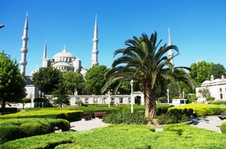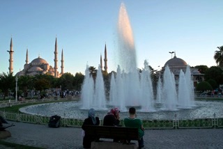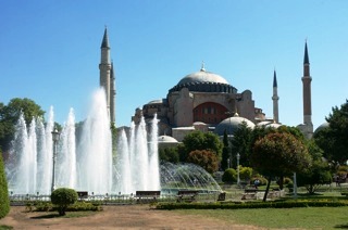 wikiで確認。ブルーモスクっていうとココのこの建物って限定できないらしい(外観がブルーのモスクは全部そう呼ぶんだって。)正式名称はスルタンアフメト・モスクだよー。世界で唯一優美な6本のミナレット(棒みたいのね)と直径27.5mの大ドームを持っているのが特徴だそーだ。