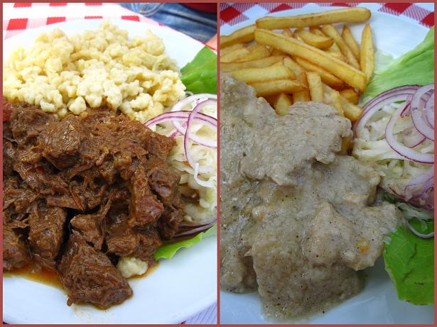 右は旦那が頼んだ牛肉のパプリカ煮。添えられているラーメンみたいなのはジャガイモで出来たニョッキみたいなもの。 私のは豚肉&チップス。おいしかったけど、両方とも味が濃い目だった。