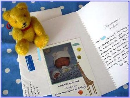 Micha って コレなんて読むの?! 「ミカァ」って感じか??? いつかMindyとDave、そしてこのお子にも会えるといいな。 後でちょこっと何かお祝い送ろう。