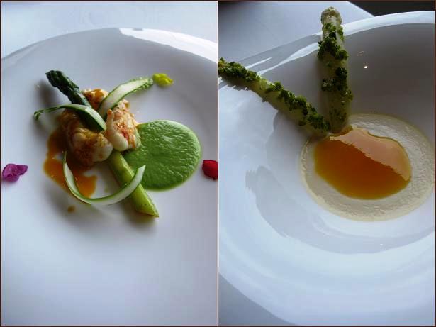 ・ラングスティーヌのロースト、パプリカを纏った緑アスパラガスの穂先 カルダモンの香るシロアスバラガスのロワイヤル、オレンジ、ピスタチオのアクセント